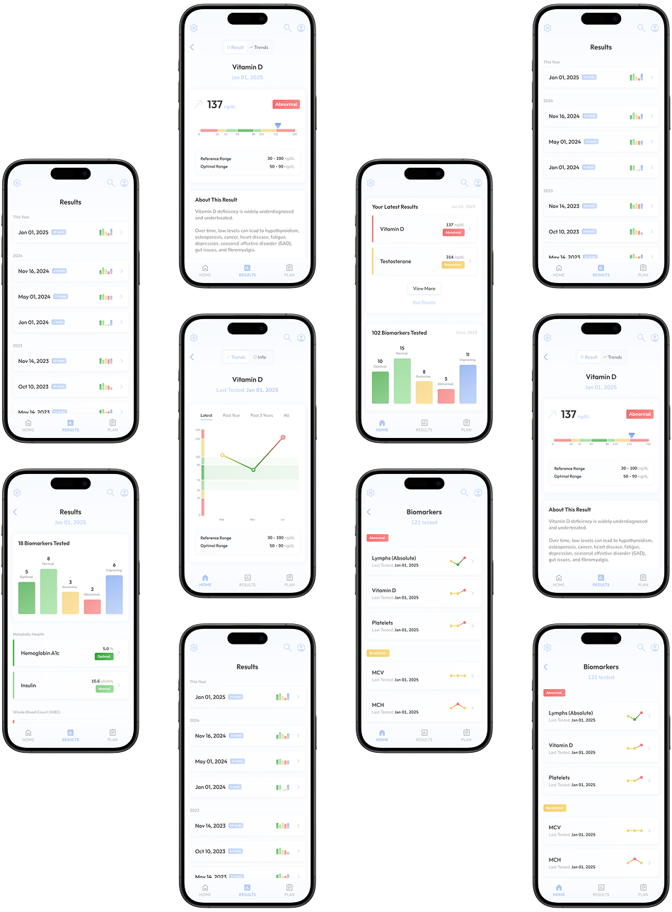 Results focused on optimization: Display biomarkers with 4 distinct ranges (abnormal, borderline, normal, optimal) instead of traditional binary normal/abnormal, with personalized explanations of what each result means for the user's specific demographics, health goals, and risk factors.