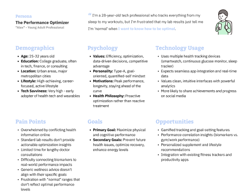 "Normal" doesn't mean optimal: The healthcare system focuses on detecting disease rather than optimizing health, leaving everyone frustrated with "you're not sick" instead of "here's how to thrive." All users need biomarker interpretation that goes beyond standard reference ranges to provide optimization targets for peak performance and longevity.