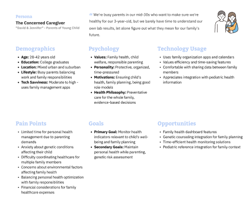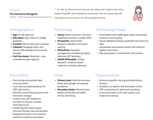 We focused on universal pain points affecting all personas: receiving digestible lab reports, categorizing results beyond normal/abnormal ranges, showing trends over time, and providing actionable improvement plans.